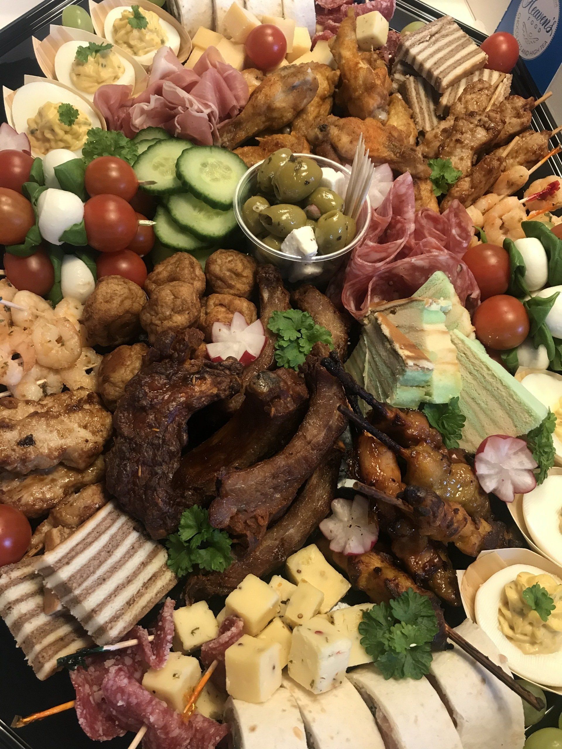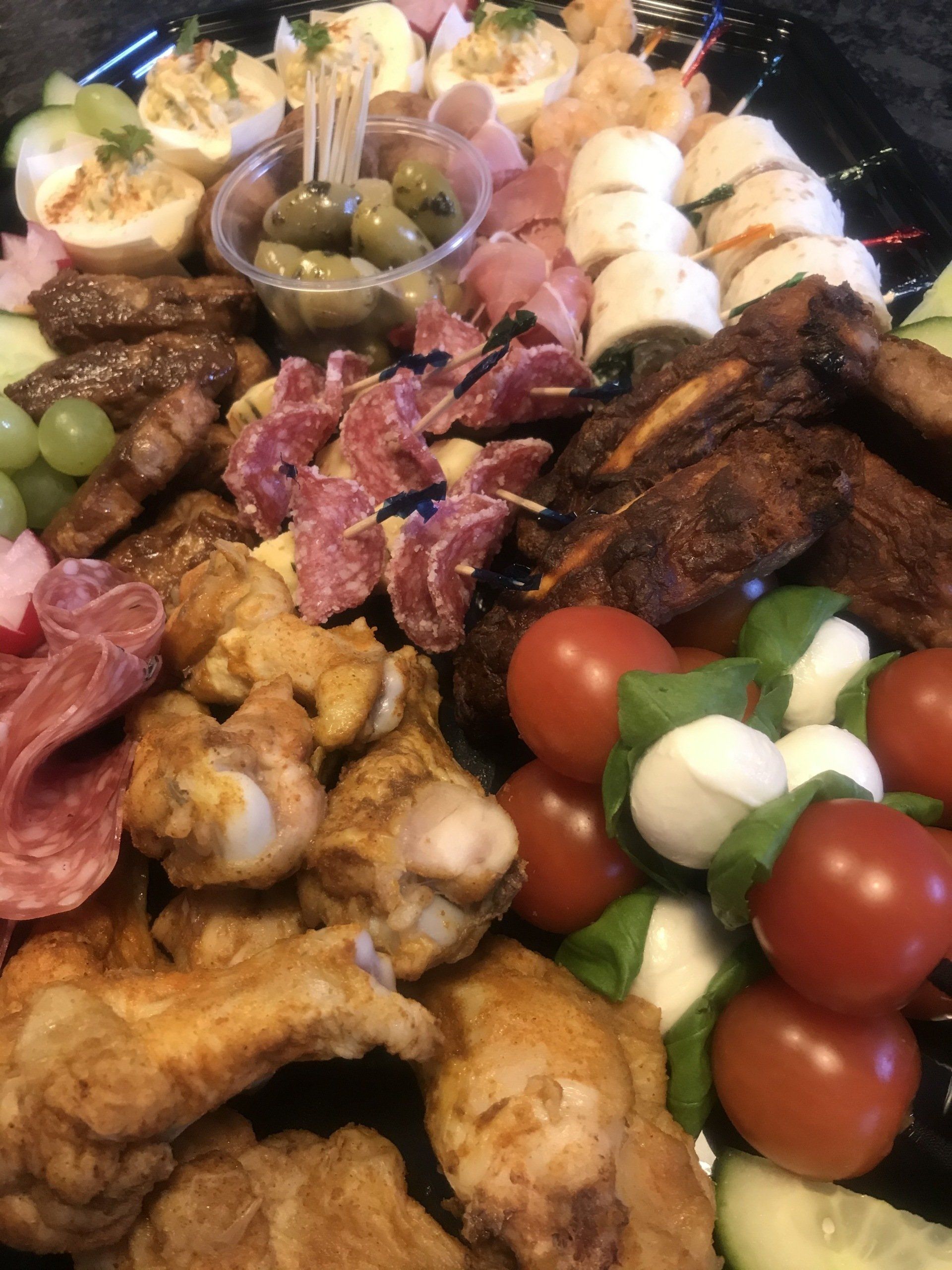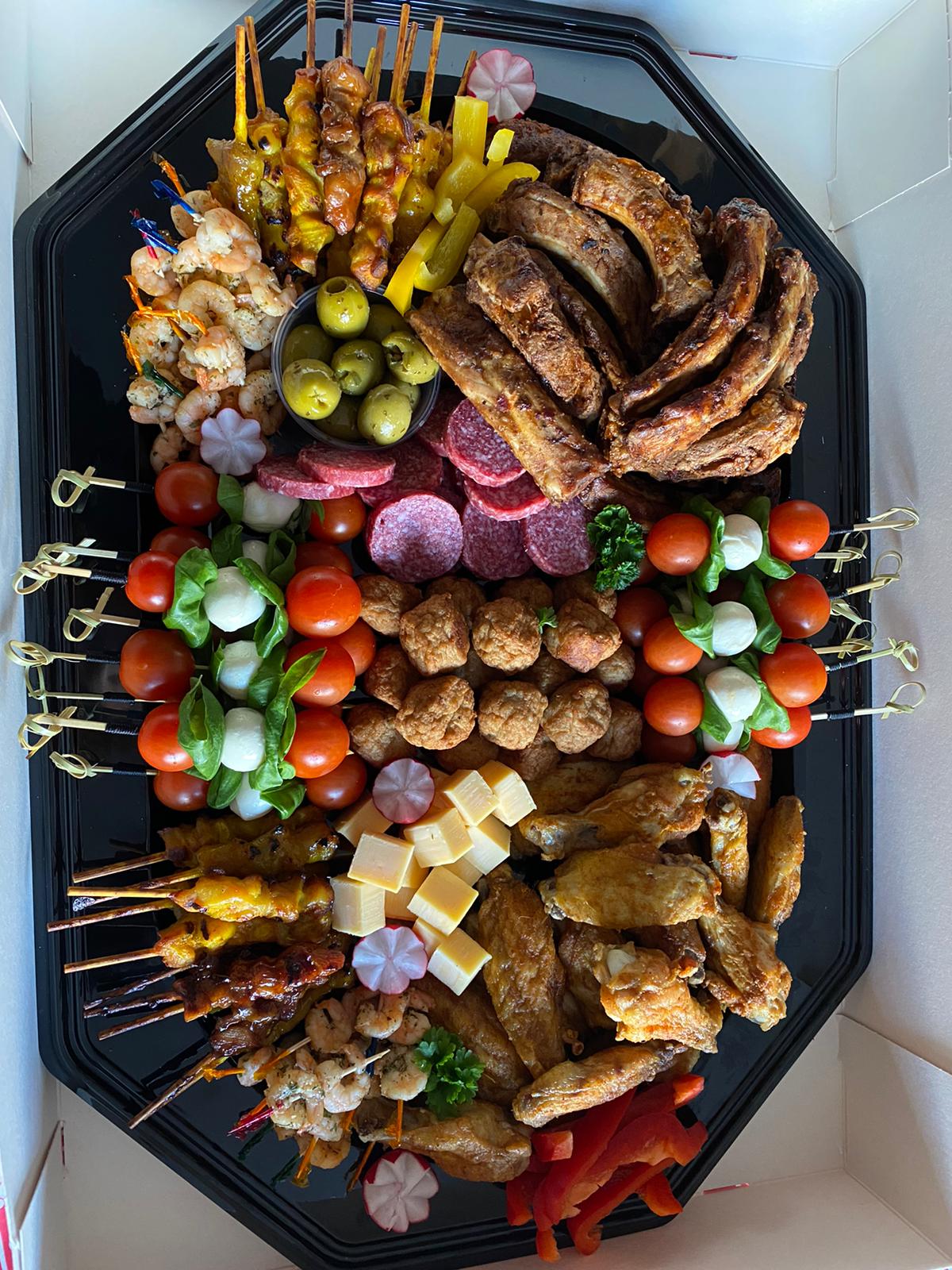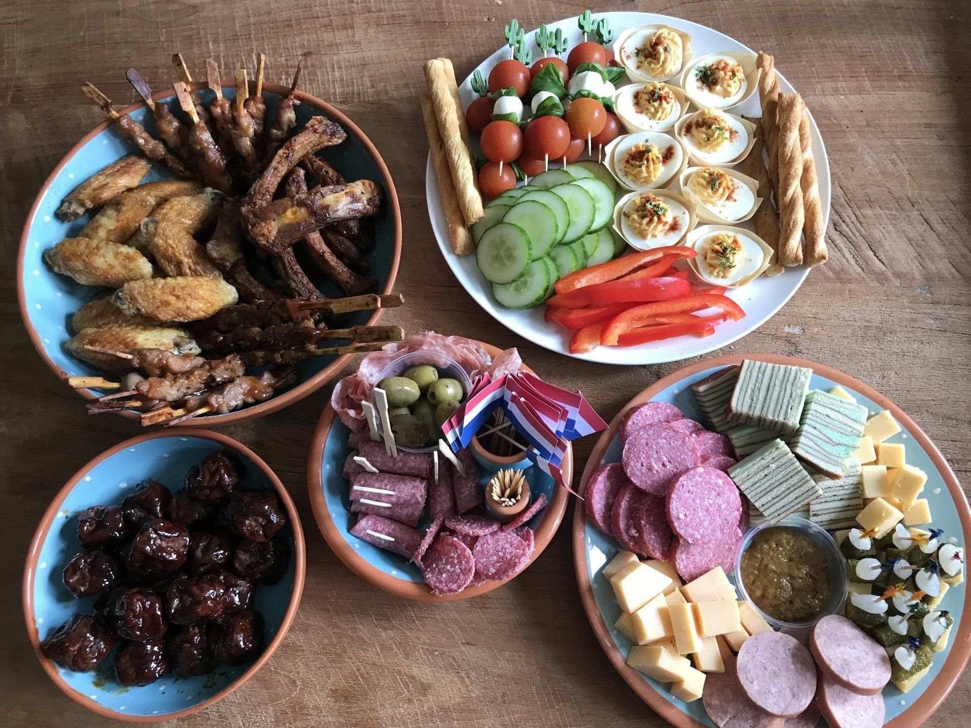 Diverse luxe hapjes: o.a. versgemaakte gevulde eieren, gegrilde spareribs, Italiaanse stokjes, mini sateetjes