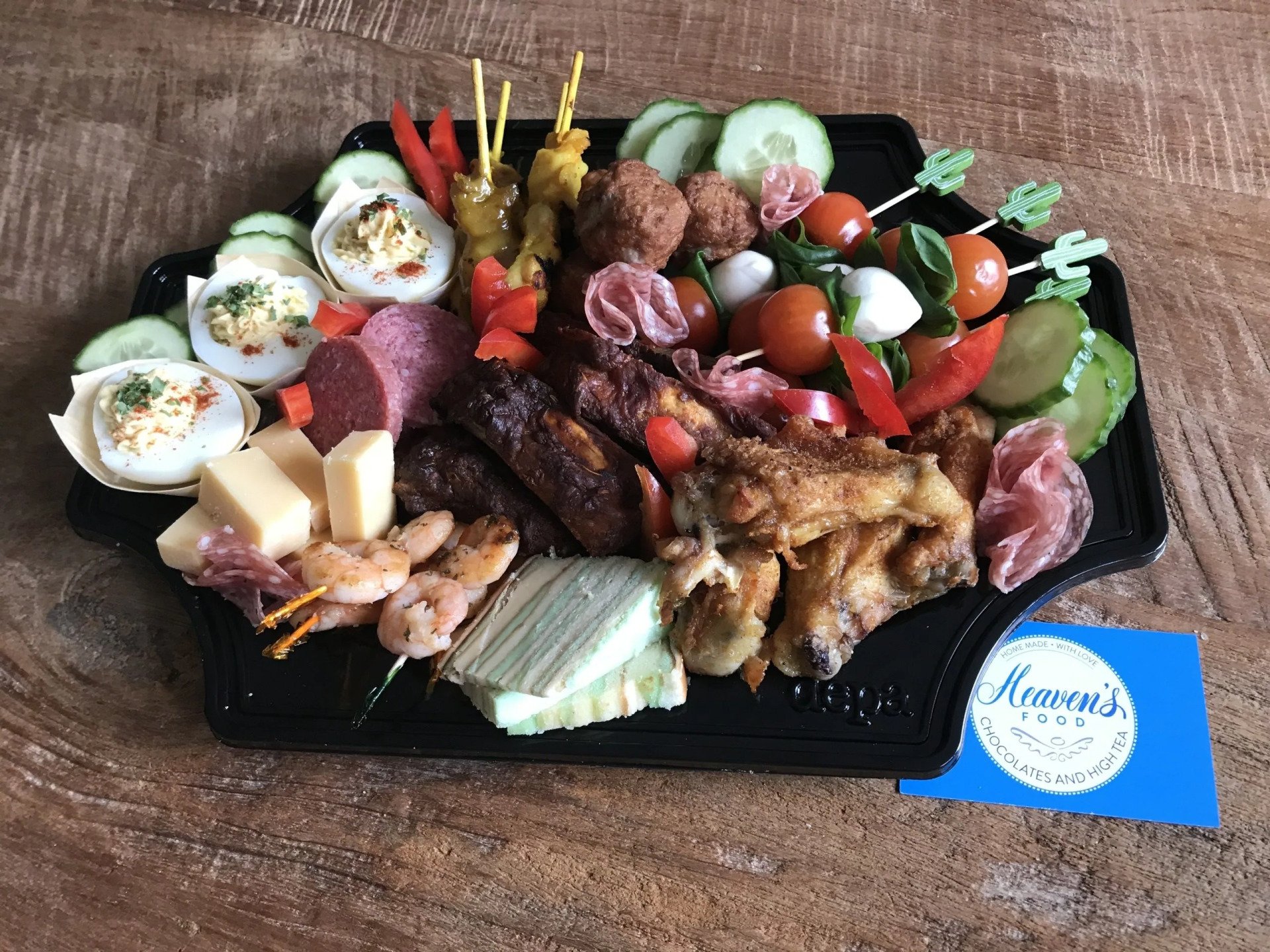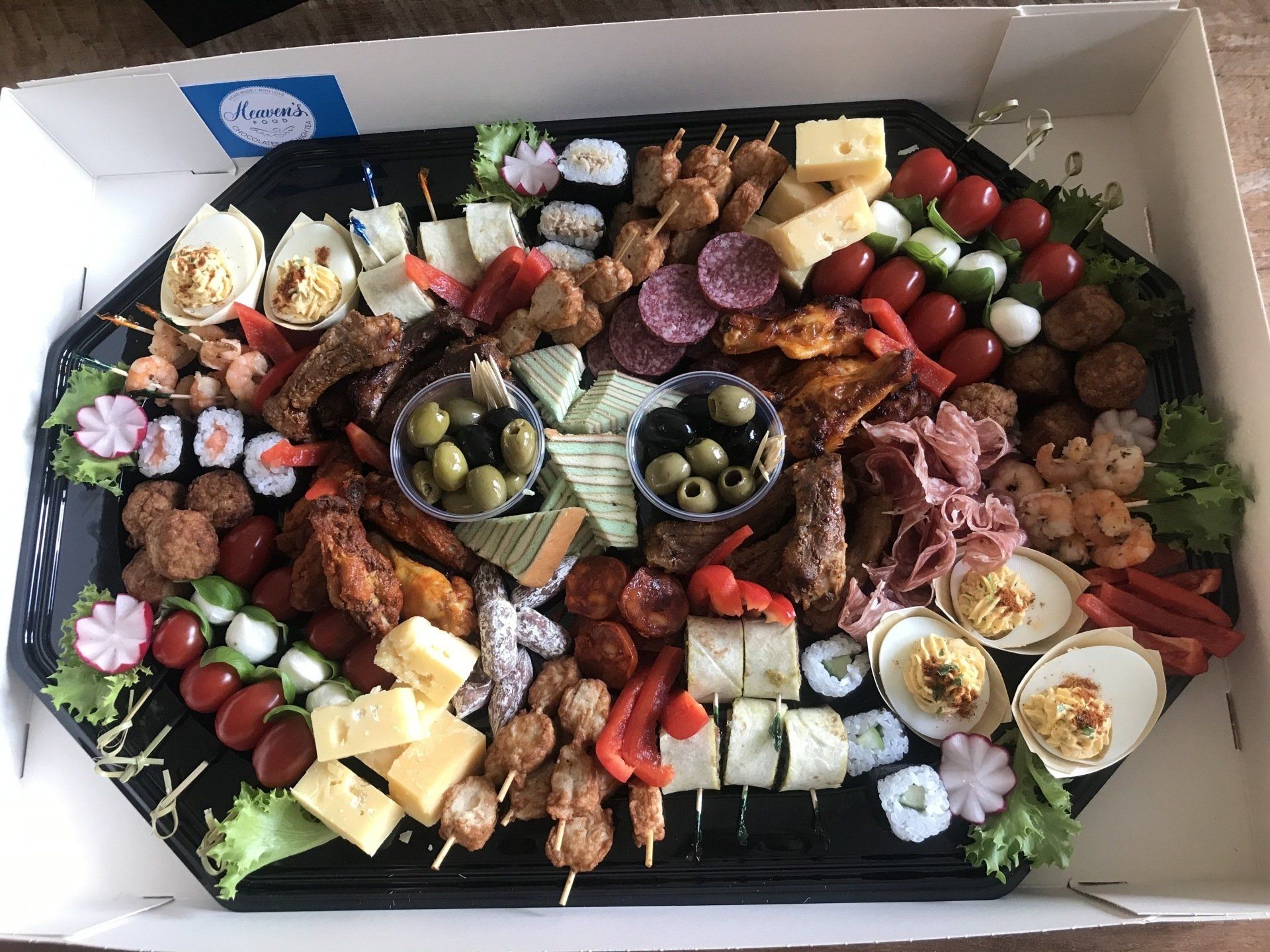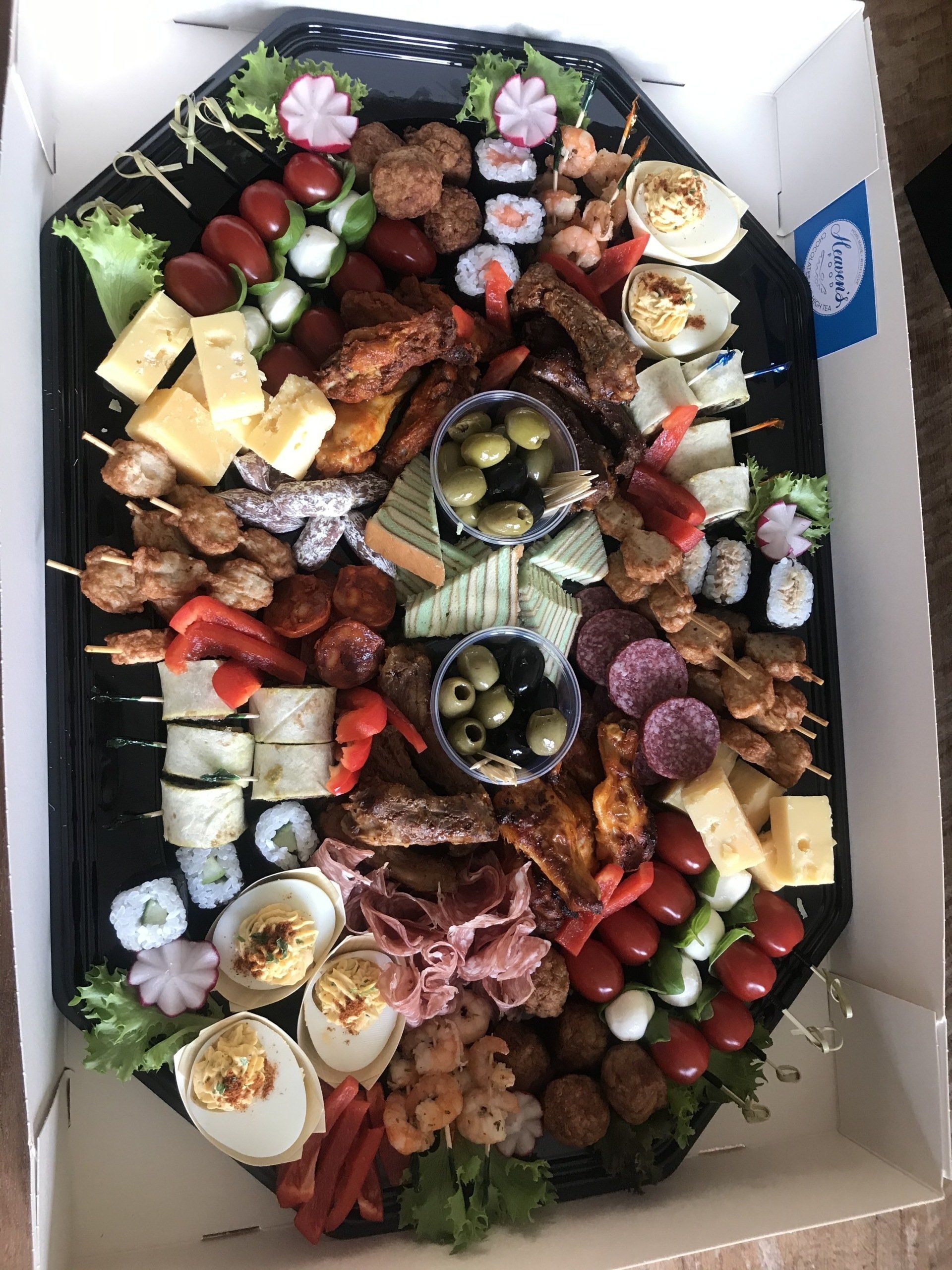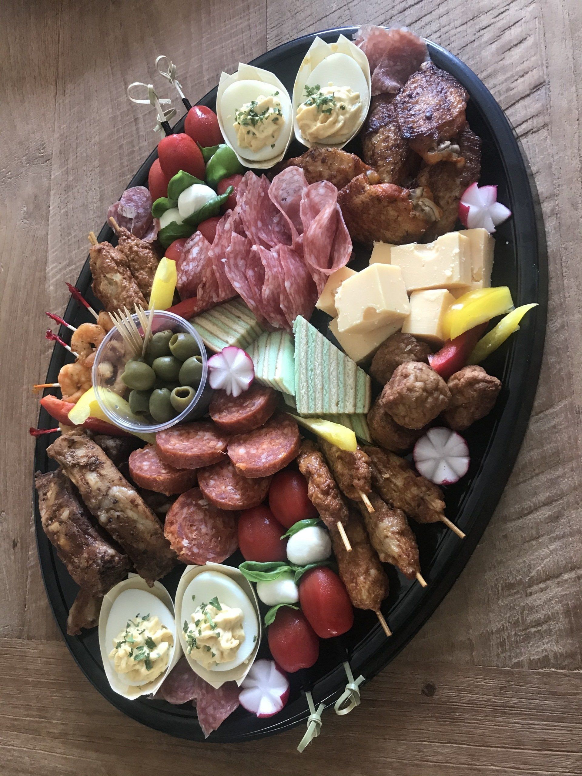 Diverse luxe hapjes: o.a. versgemaakte gevulde eieren, gegrilde spareribs, Italiaanse stokjes, mini sateetjes