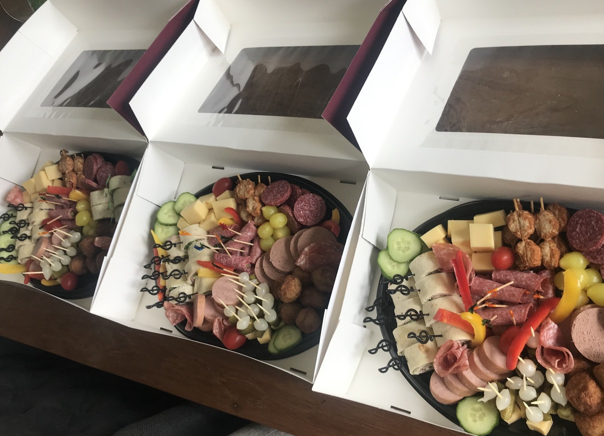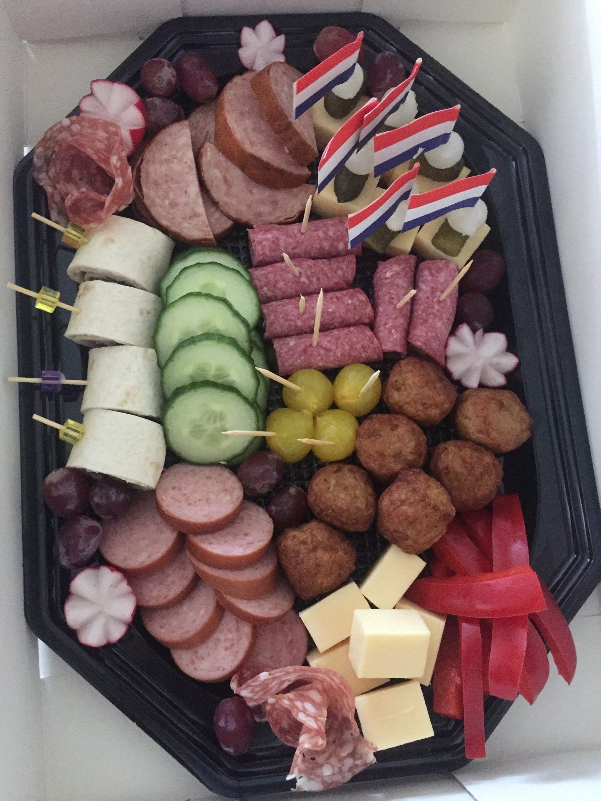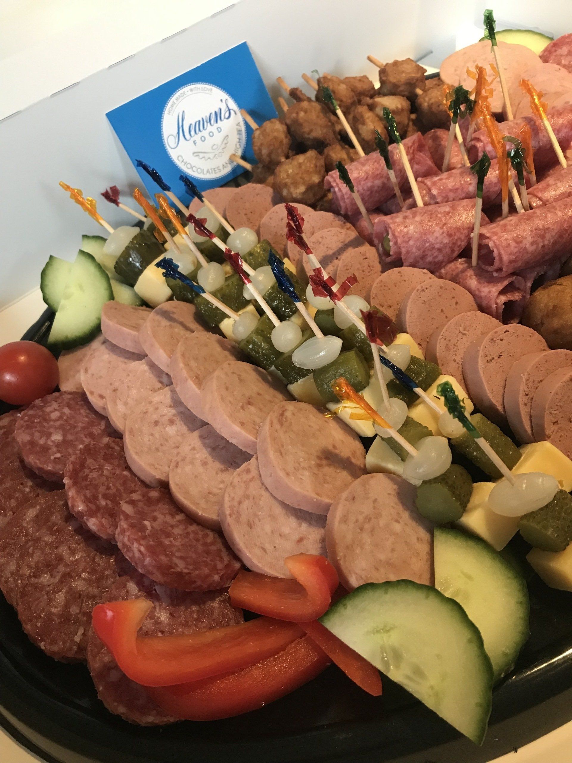 Diverse hartige hapjes uit het vuistje: o.a. vers gebraden gehaktballetjes, kaas, verschillende soorten worst, mini sateetjes