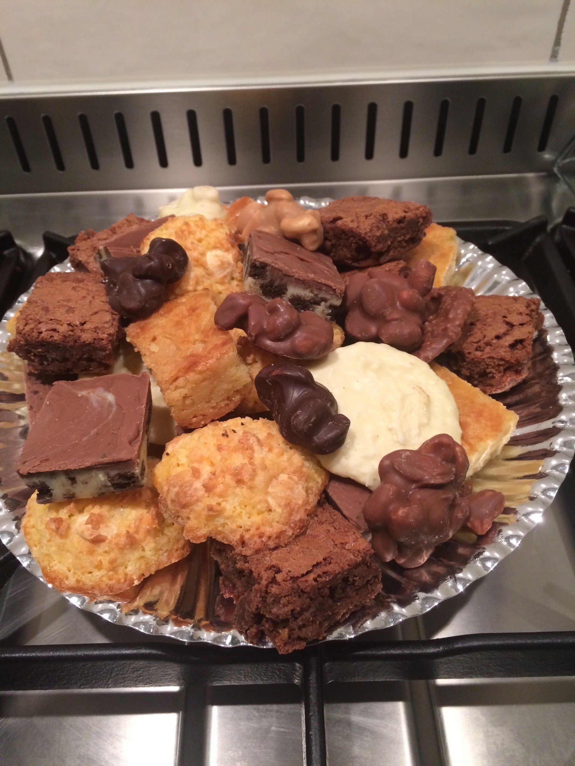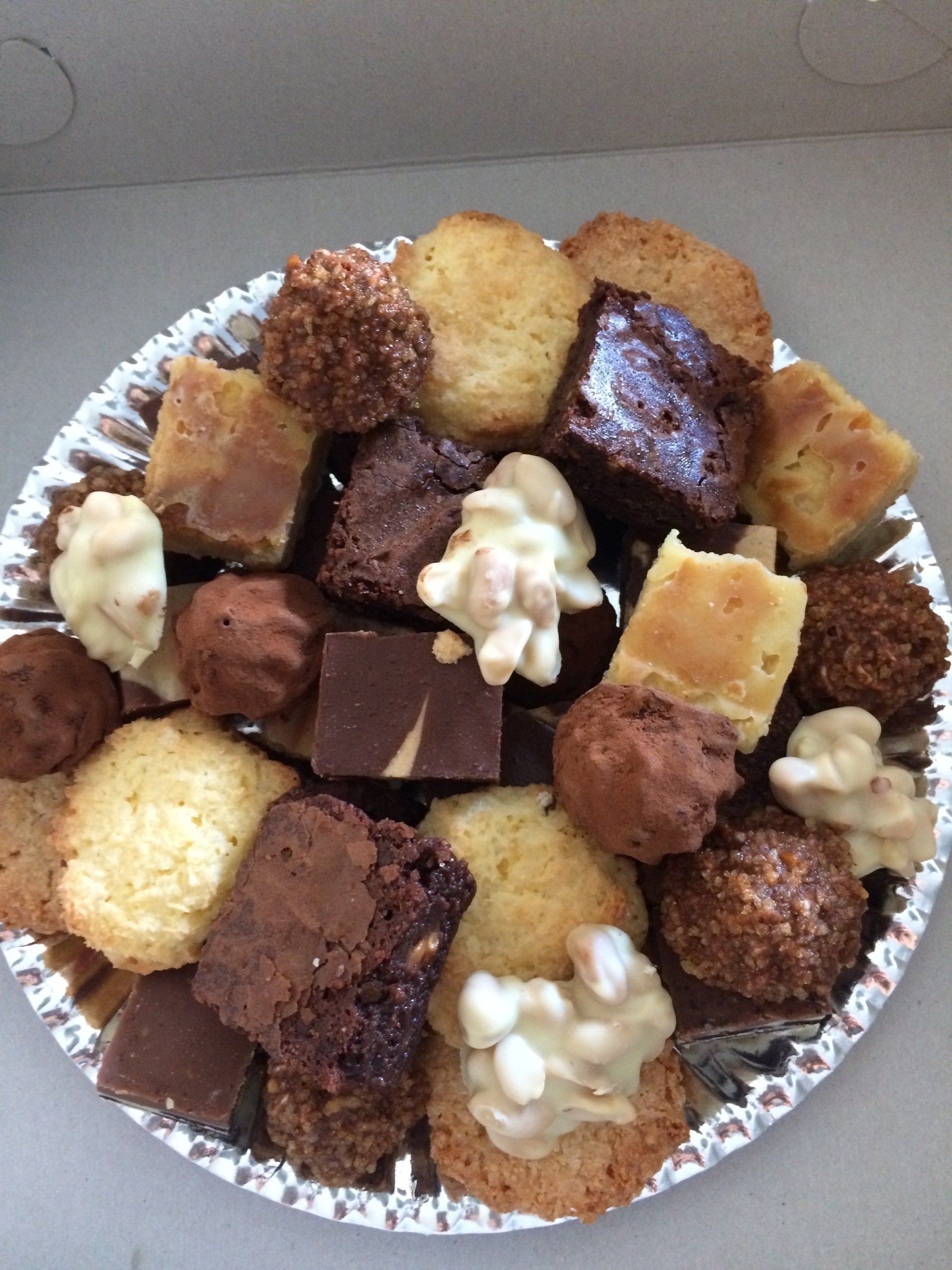 Diverse zoete hapjes: o.a. roomboter boterkoek, karamel-noten brownies, diverse soorten fudge, kokosmacroontjes, pindarotsjes
