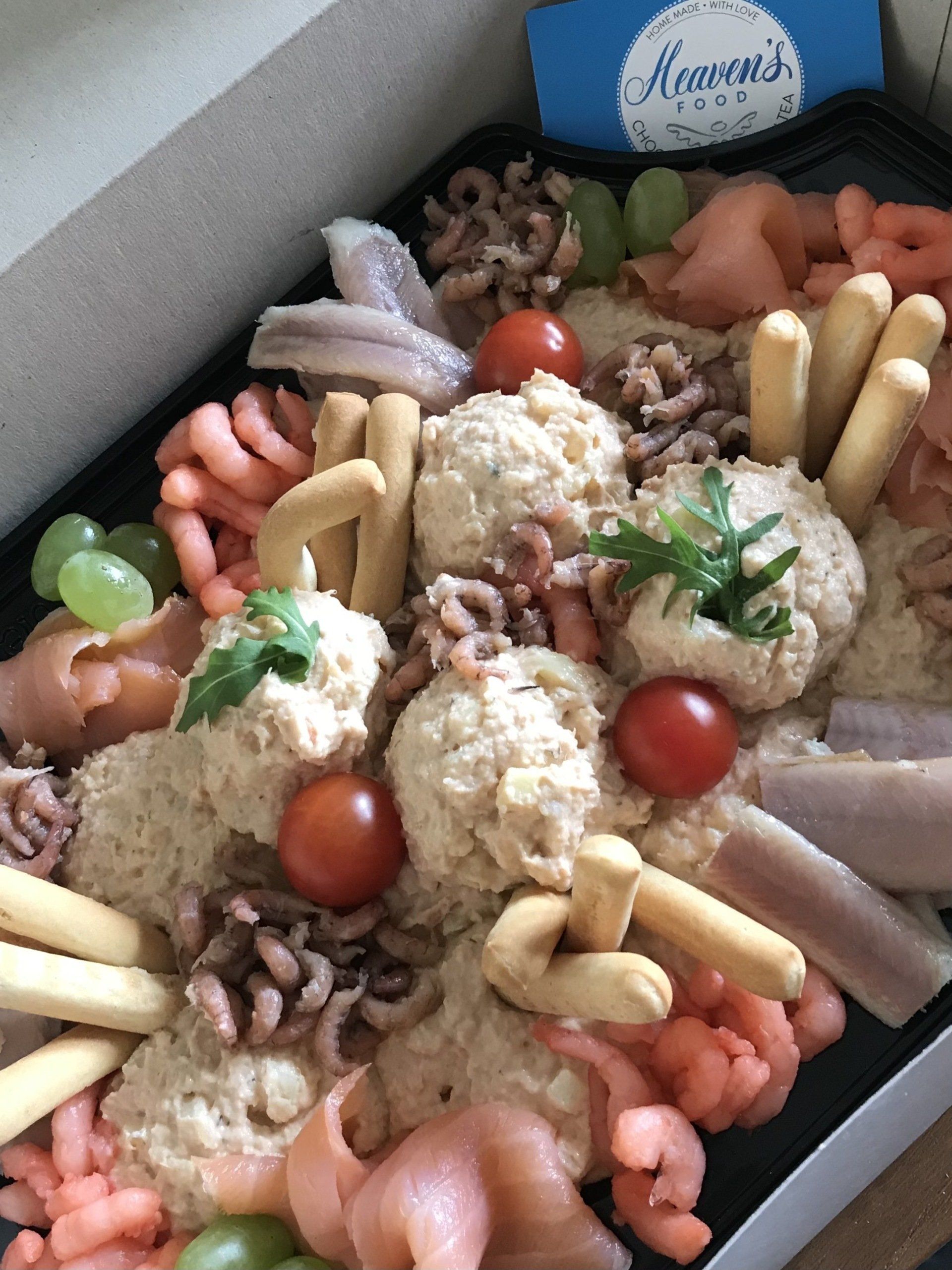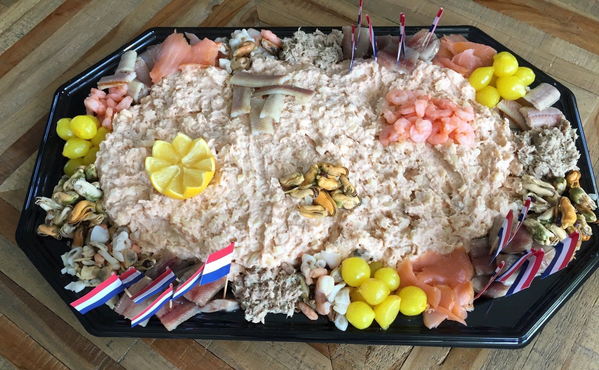 Heerlijke vissalade met luxe vis zoals paling, garnalen, mosselen, zalm etc.