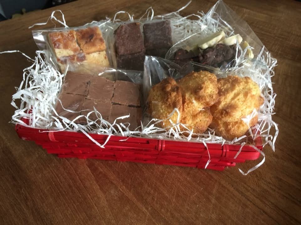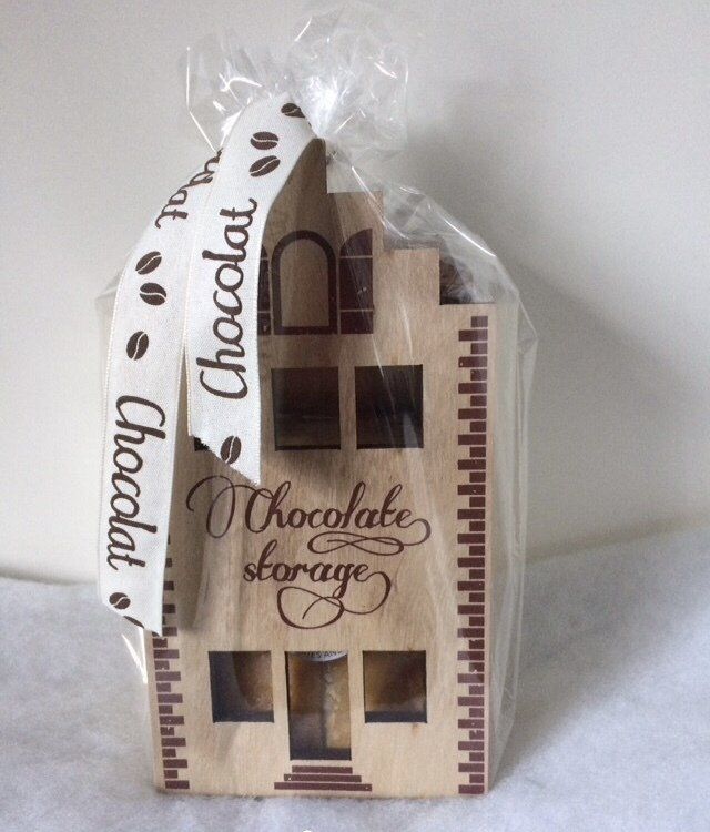Houten huis gevuld met 3 zakjes koek of chocolade naar keuze. Bv. Pindarotstjes, brownies, boterkoek, fudge of kokosmakroontjes)